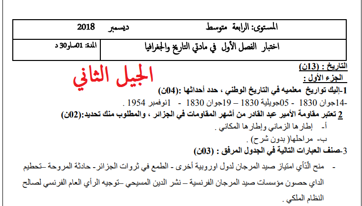 اختبارات محلولة في التاريخ والجغرافيا للسنة الرابعة متوسط الجيل الثاني الفصل الاول