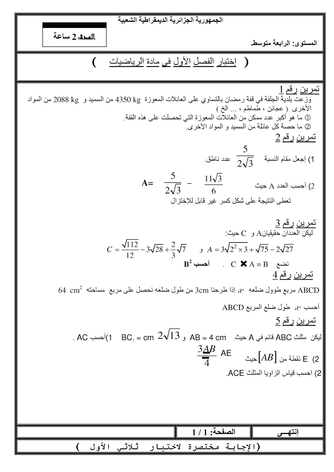 الموقع الاول للتعليم في الجزائر اختبار الرياضيات مع التصحيح للسنة الرابعة متوسط للفصل الأول