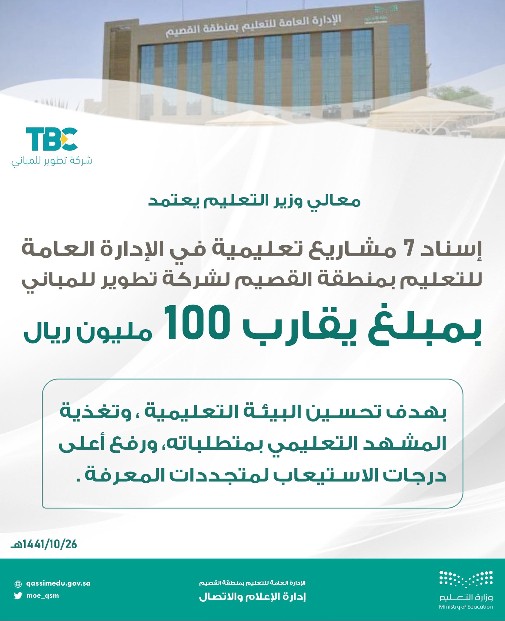 إدارة تعليم القصيم On Twitter مشاريع معالي وزير التعليم يوافق على إسناد 7 مشاريع تعليمية في تعليم القصيم لشركة Tatweerbuilding بقيمة تصل لـ 100 000 000 ريال مائة مليون ريال النفاصيل Https T Co Nv2unsyfjt