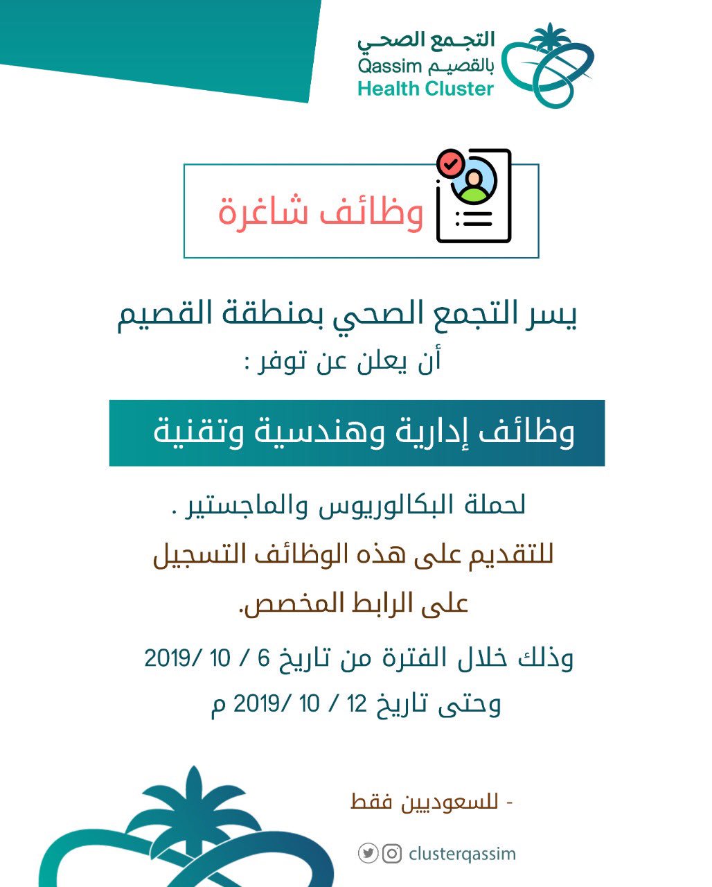 التجمع الصحي بالقصيم Ar Twitter وظائف شاغرة يسر التجمع الصحي بمنطقة القصيم أن يعلن عن توفر وظائف إدارية هندسية تقنية لحملة البكالوريوس والماجستير والتقديم من خلال الرابط Https T Co Nxln6nifxy في الفترة من 6 10 2019م