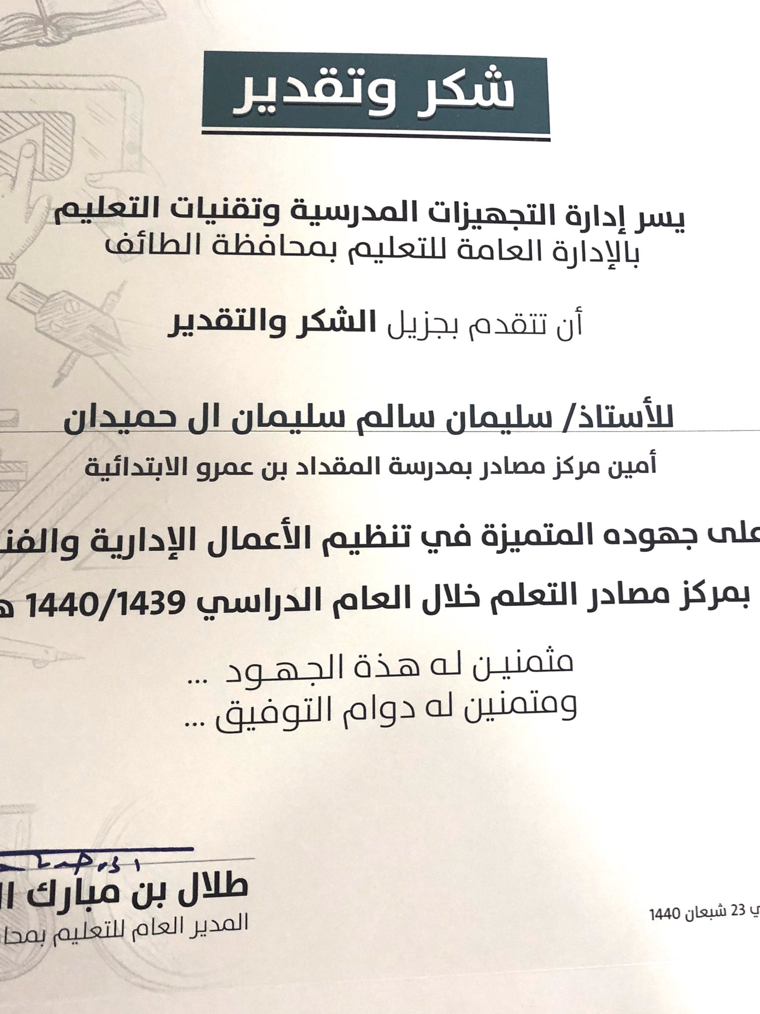 مدرسة المقداد بن عمرو الابتدائية بالطائف On Twitter يحدث الآن شكر وتقدير للأستاذ سليمان الحميدان مقدم من ادارة التجهيزات المدرسية وتقنيات التعليم على جهوده في تنظيم الأعمال الإدارية والفنية Taif East Taifedugov Https T Co Dzslalz2ly