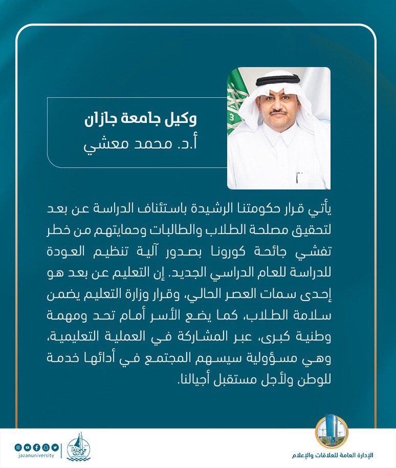 Uzivatel جامعة جازان Na Twitteru إن التعليم عن بعد بات من سمات العصر وقرار وزارة التعليم باستئناف الدراسة عن بعد يضمن سلامة الطلبة كما يضع الأسر أمام تحد ومهمة وطنية كبرى بالمشاركة في