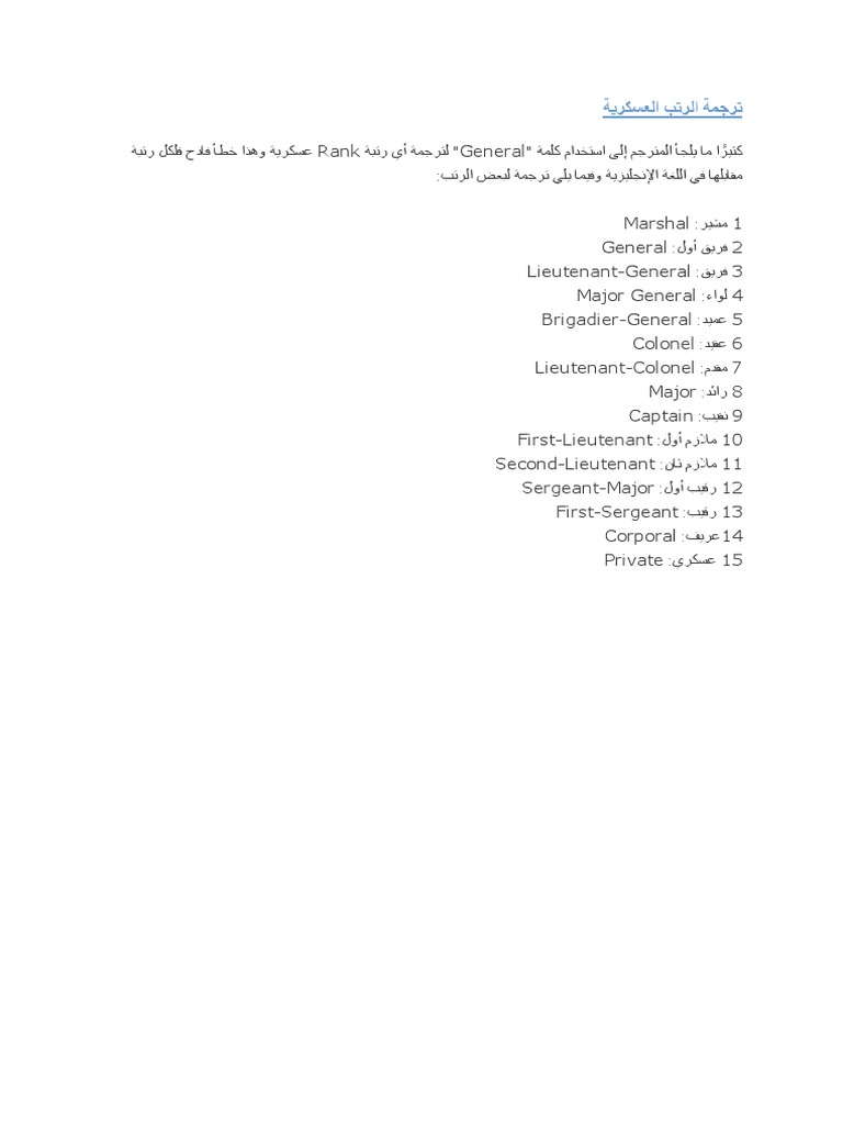 الرتب العسكرية بالانجليزي pdf. مفردات انجليزية اسماء الرتب العسكرية باللغة الانجليزية الانجليزية للمبتدئين اسماء الرتب العسكرية باللغة الانجليزية تعلم الانجليزية اسماء الرتب العسكرية باللغة الانجليزية كلمات انجليزية اسماء الرتب العسكرية. مصطلحات عسكرية مترجمة نقدمها لكل باحث فى هذا الموضوع وخاصة طلبة الكليات والمعاهد العسكرية فسوف نقدم فى هذا الموضوع مصطلحات عسكرية مستخدمة بكثرة مترجمة الي اللغة الانجليزية حتي يستفيد الطالب منها فى كتابة الموضوعات. الرتب العسكرية بالانجليزية كلمات انجليزية مترجمة. الرتب العسكرية السعودية توضح التدرج بين الأفراد والضباط المنتسبين لأحد الوزارات السيادية التالية بالمملكة العربية السعودية وهي.